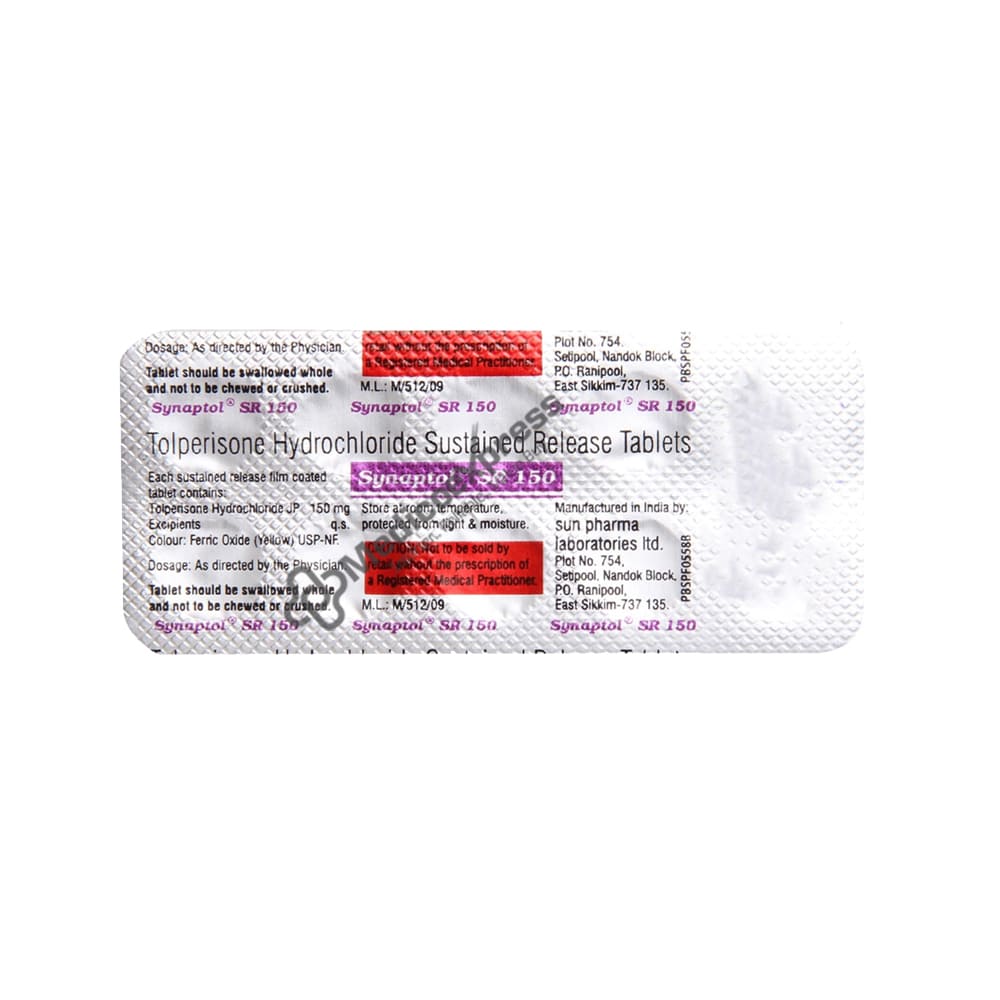 Synaptol SR 150 Tablet 10's is a medication that belongs to a class of drugs known as centrally acting muscle relaxants. Synaptol SR 150 Tablet 10 is prescribed for the treatment of acute musculoskeletal pain (pain within the body starts from muscles, bones, or joints).Disclaimer:For More Information Contact Your Physician