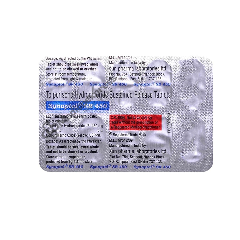 Synaptol SR 450 Tablet 10 is a medication that belongs to a class of drugs known as centrally acting muscle relaxants. It is employed in the treatment of acute musculoskeletal pain (pain within the body starts from muscles, bones, or joints).Disclaimer:For More Information Contact Your Physician