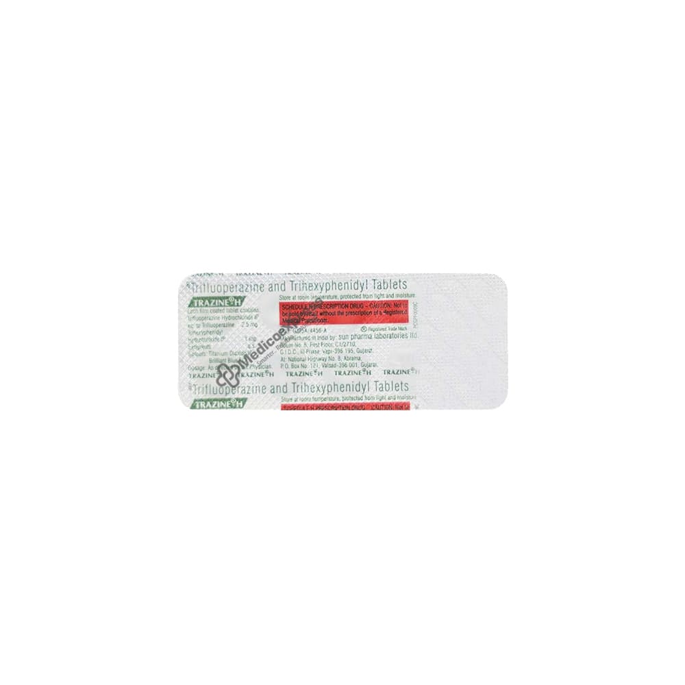 Trazine-H Tablet is a combination medication used to treat schizophrenia (a mental disorder in which a person develops unreal thoughts and behavior). It modifies thoughts and elevates mood, enhancing a person's ability to think, feel, and behave.Disclaimer:For More Information Contact Your Physician