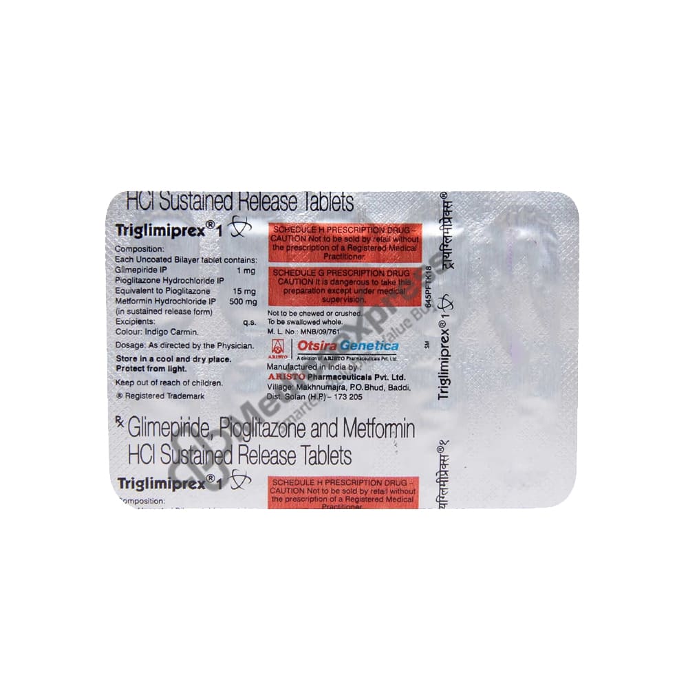 Triglimiprex 1 mg Tablet 10's is a member of the class of drugs known as "antidiabetic agents," which is used to treat Type 2 diabetes mellitus. A chronic or lifelong illness known as type 2 diabetes mellitus causes abnormally high blood sugar or glucose levels. It happens when the body cannot adequately use any insulin that is created or when there is insufficient insulin to properly metabolise glucose in the body. Metformin, glimepiride, and pioglitazone are the three medications included in Triglimiprex 1 Tablet 10's. Metformin works by reducing intestinal glucose absorption and hepatic glucose synthesis. Glimepiride works by increasing the pancreas' production of insulin. Pioglitazone reduces the amount of glucose that the liver releases while simultaneously increasing the sensitivity of tissues to the actions of insulin. Disclaimer:For more information contact your physician.