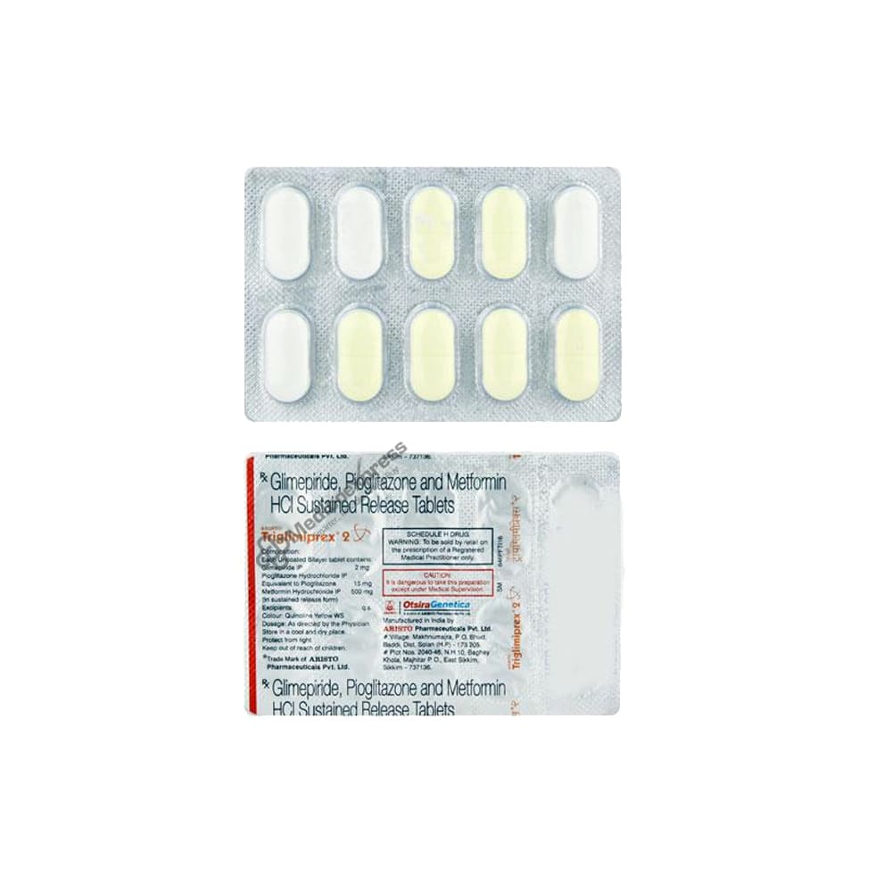 Triglimiprex 2 mg Tablet 10 is a member of the class of drugs known as "antidiabetic agents," which is used to treat Type 2 diabetes mellitus. A chronic or lifelong illness known as type 2 diabetes mellitus causes abnormally high blood sugar or glucose levels. It happens when the body cannot adequately use any insulin that is created or when there is insufficient insulin to properly metabolise glucose in the body. Metformin, glimepiride, and pioglitazone are the three medications included in Triglimiprex 2 Tablet 10's. Metformin works by reducing intestinal glucose absorption and hepatic glucose synthesis. Glimepiride works by increasing the pancreas' production of insulin. Pioglitazone reduces the amount of glucose that the liver releases while simultaneously increasing the sensitivity of tissues to the actions of insulin. Disclaimer:For more information contact your physician.