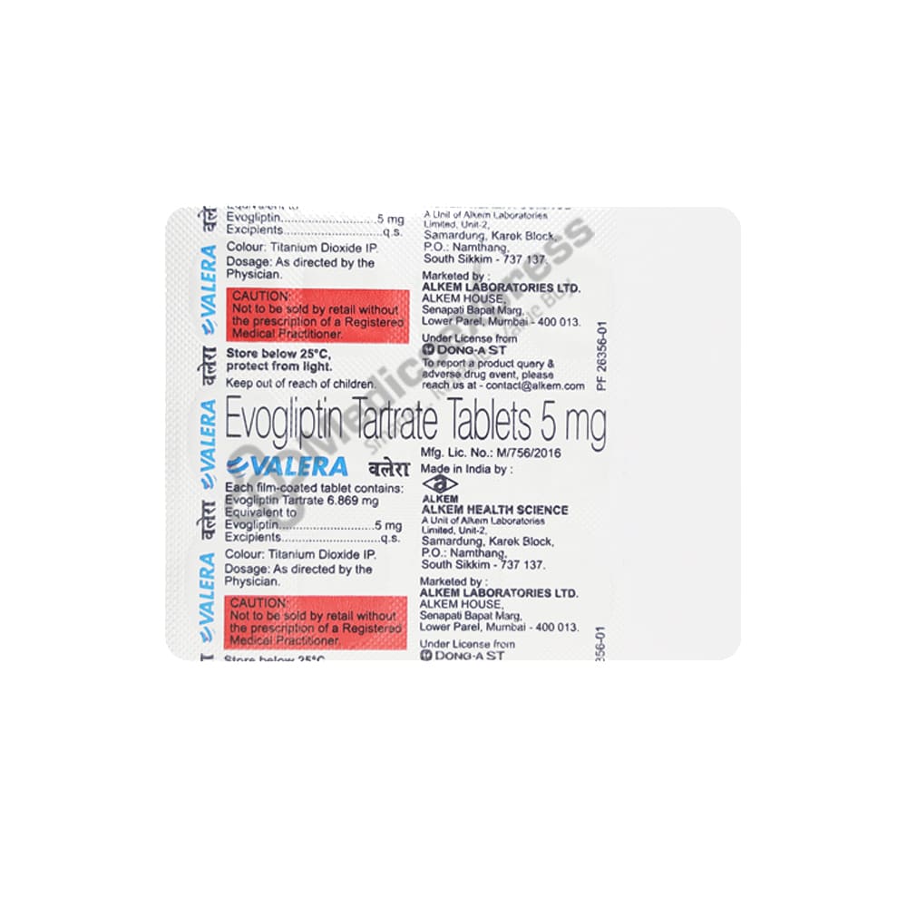 VALERA Tablet 15's contains evogliptin which serves as the active component of the oral diabetes medication. Along with a strict diet and regular exercise, it is used to control Type 2 Diabetes mellitus. Due to the lack of safety information for patients over 65 and minors, the use of this medication is not advised. Without first consulting your doctor, avoid using this medication if you are pregnant or nursing. Without a doctor's prescription, it is not advisable to use this medication in people with liver, renal, or cardiac illness. Patients with a history of pancreatic inflammation should avoid taking Valera 5 since it might cause severe, ongoing stomach pain.Disclaimer:For more information contact your physician.