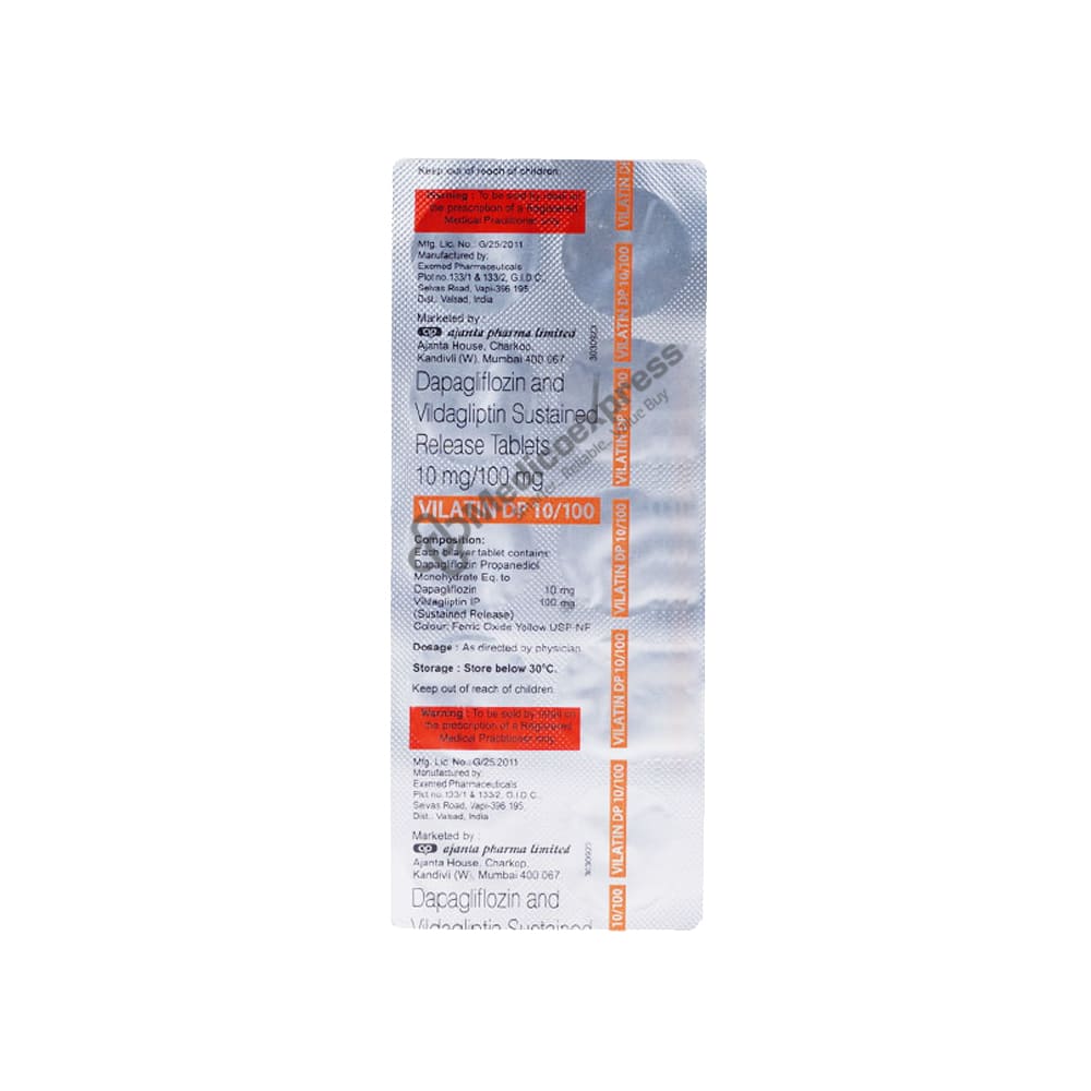 VILATIN DP 100/10 TABLET is a combination of Dapagliflozin and Vildagliptin, both of which are anti-diabetic agents. It is used to treat type II diabetes in adults who are not well controlled on metformin alone.Disclaimer:For More Information Contact Your Physician