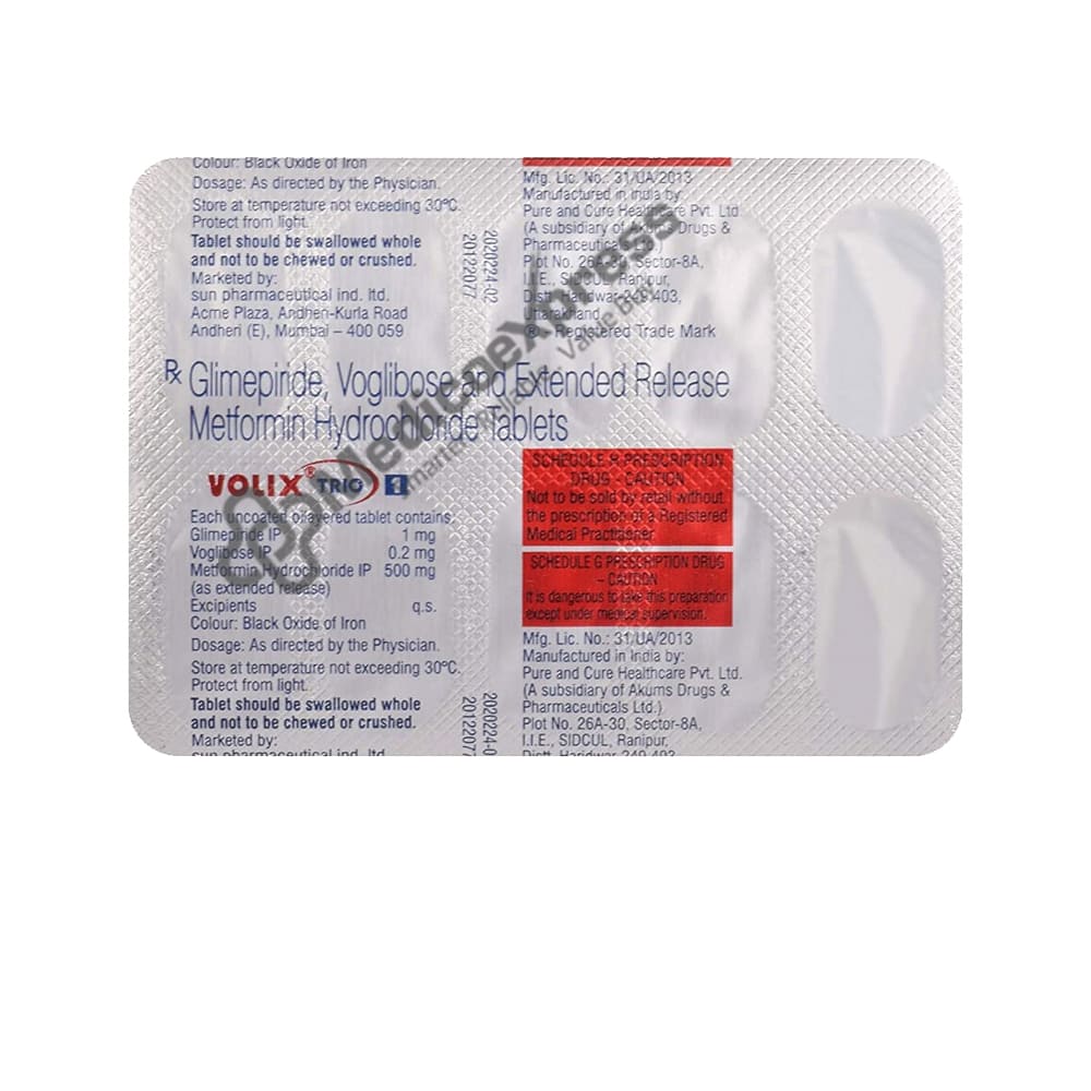 Volix Trio 1 Tablet 10's Is An Anti-Diabetic Drug Combination Used To Treat Type 2 Diabetes Mellites.Disclaimer:For More Information Contact Your Physician
