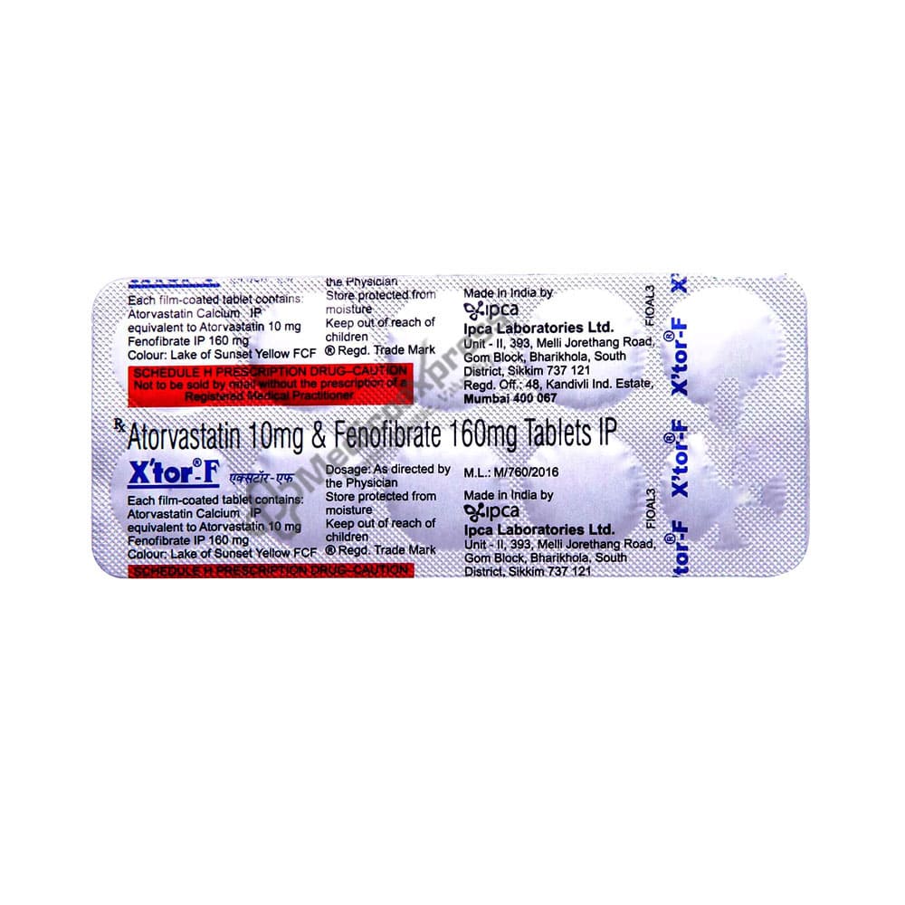 X Tor F Tab Tablet 10's is a drug combination made up of Atorvastatin and Fenofibrate, both of which lower cholesterol and bad lipids (triglycerides) in the blood and are primarily used to prevent heart disease and blood vessel blockage.Disclaimer:For More Information Contact Your Physician