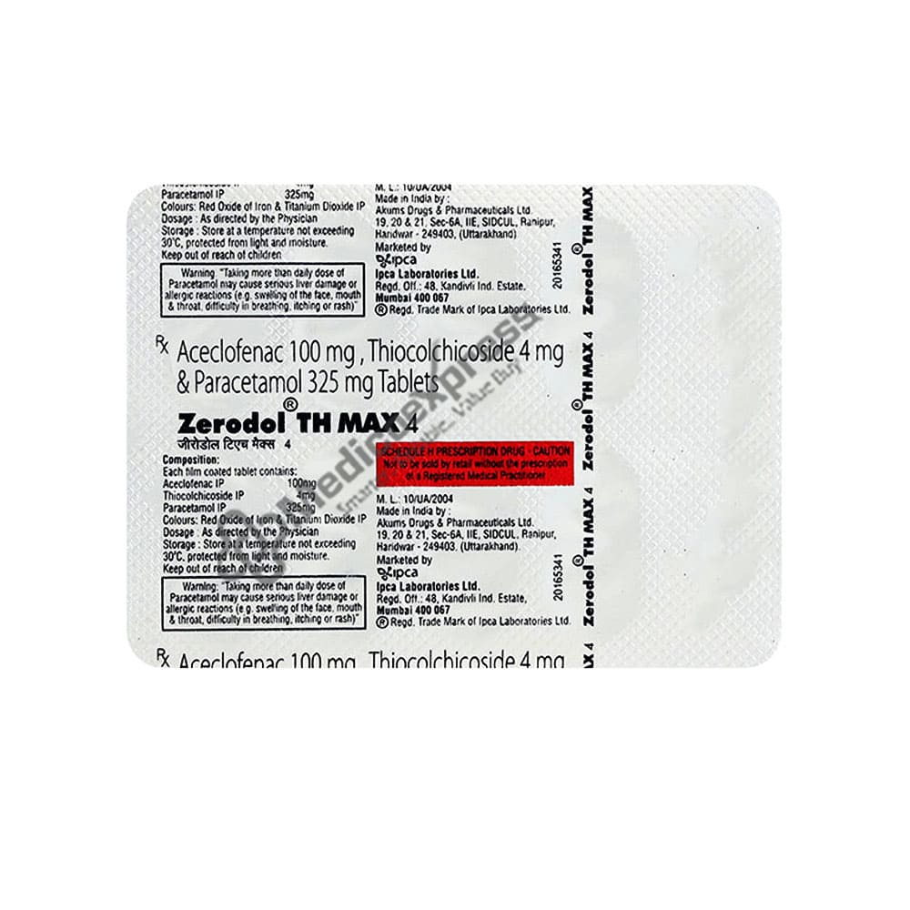 Zerodol th 4 tablet is a combination drug used to alleviate and treat pain associated with degenerative vertebral disorders, dorsal discomfort, torticollis (neck muscle contractions), vertebral static issues, and low back pain.Disclaimer:For more information contact your physician