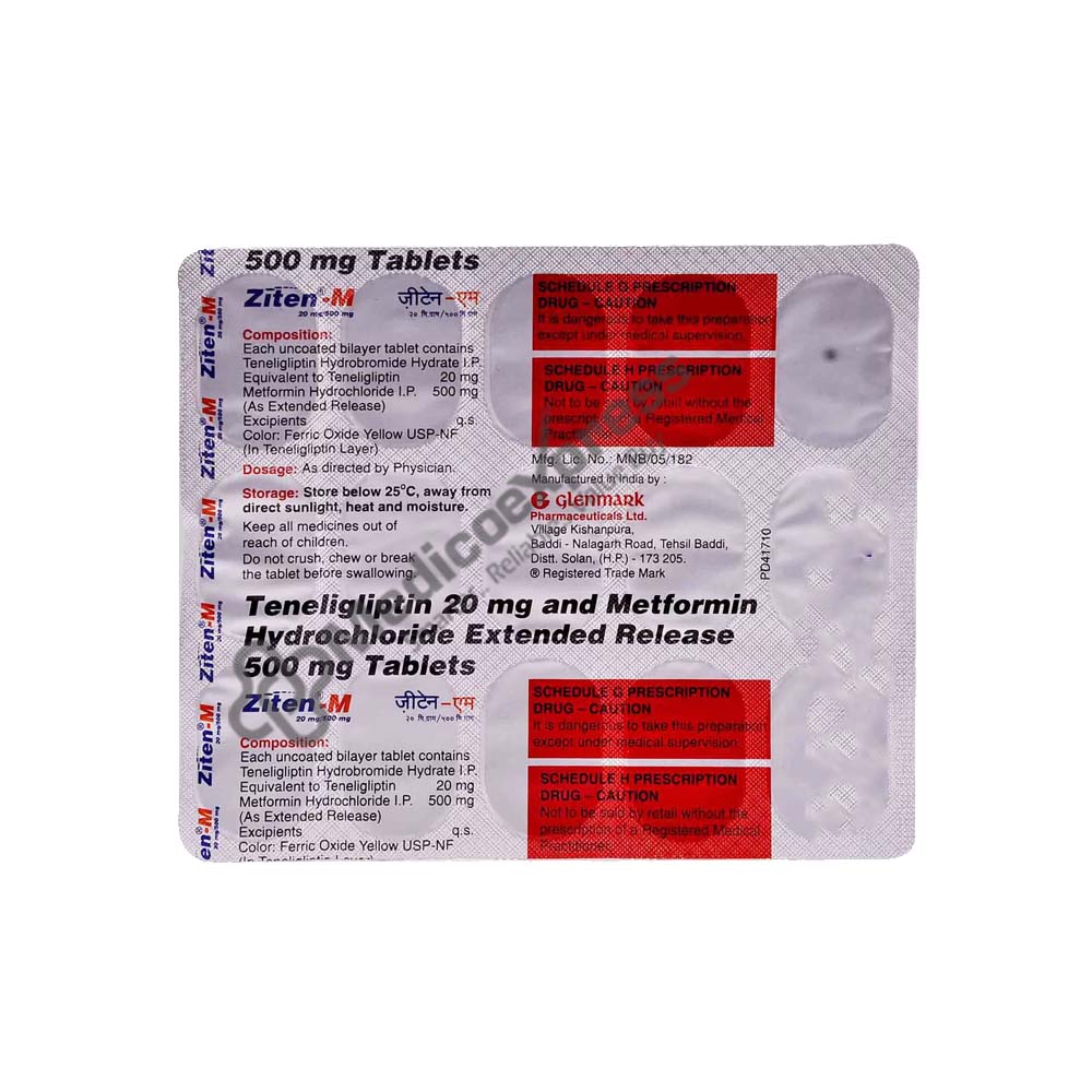 ZITEN M 20/500MG TABLET is an anti-diabetic drug that combines the medications metformin and teneligliptin. It is used to treat Type II diabetes mellitus in patients when diet, exercise, and treatment with other conventional medications do not produce adequate blood glucose control.Disclaimer : For More Details, Contact Your Physician